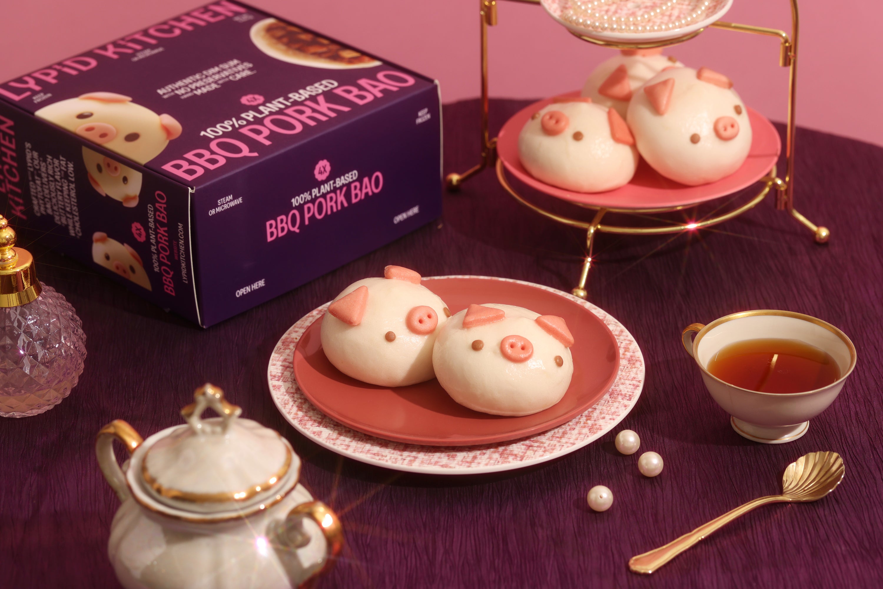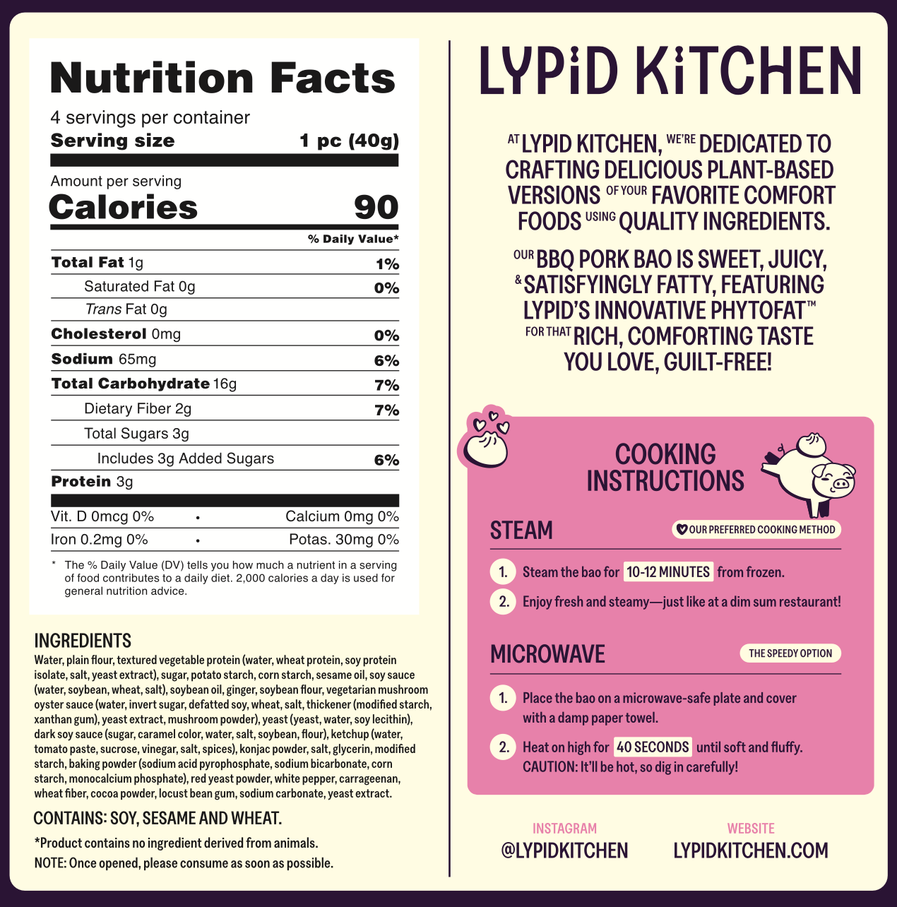 Our Piggy Bao is filled with a sweet, juicy, and savory plant-based BBQ pork made using simple ingredients like soy protein, wheat, sugar, and our signature PhytoFat technology for a rich, tender texture. It’s 100% plant-based, preservative-free, and packed with flavor—just like the classic char siu bao, but guilt-free!